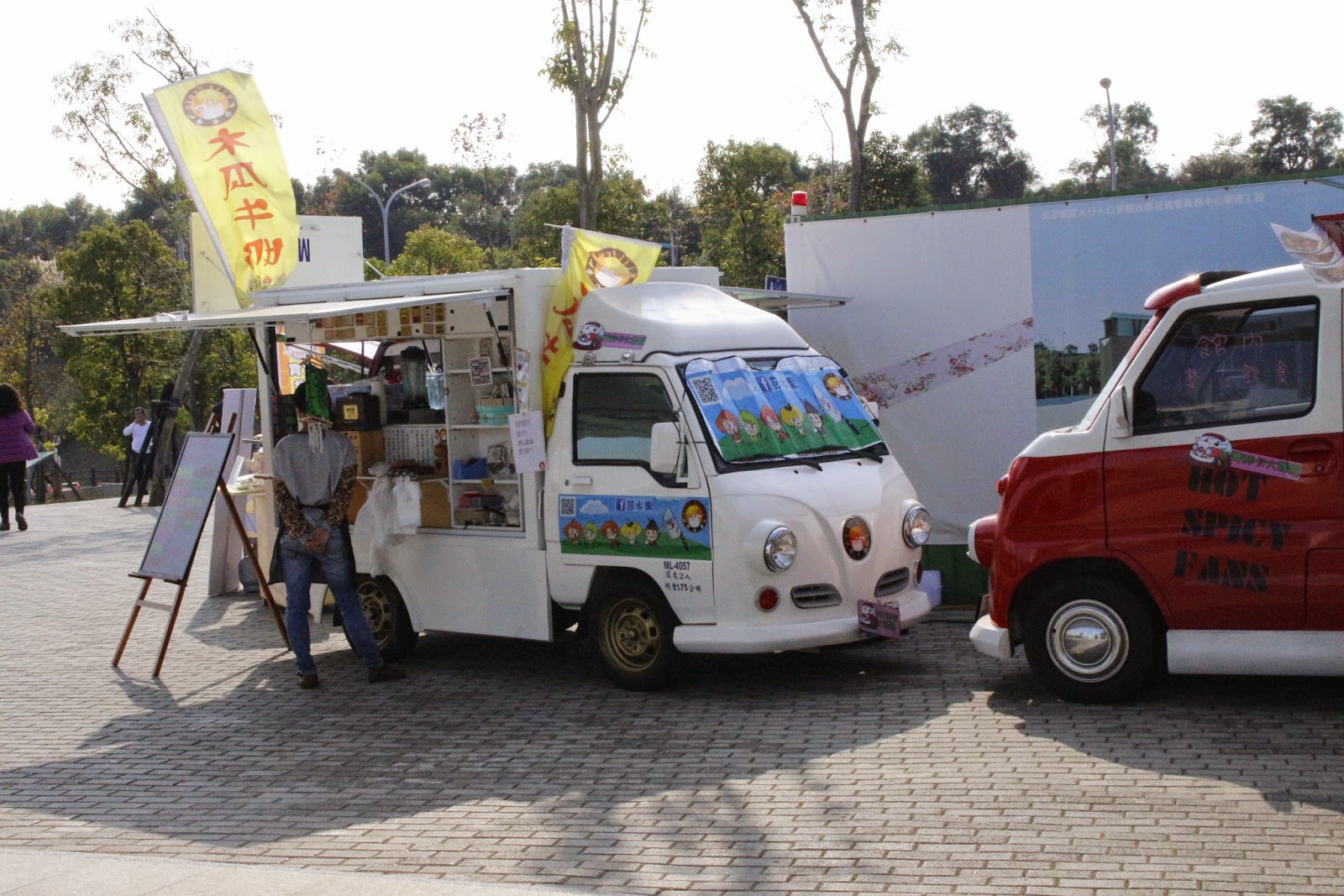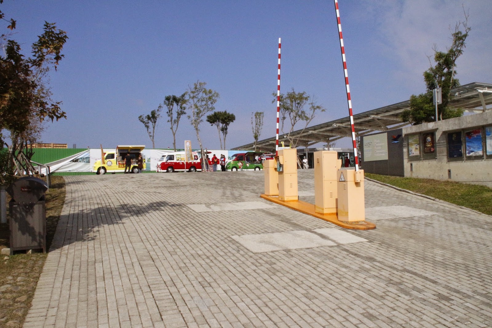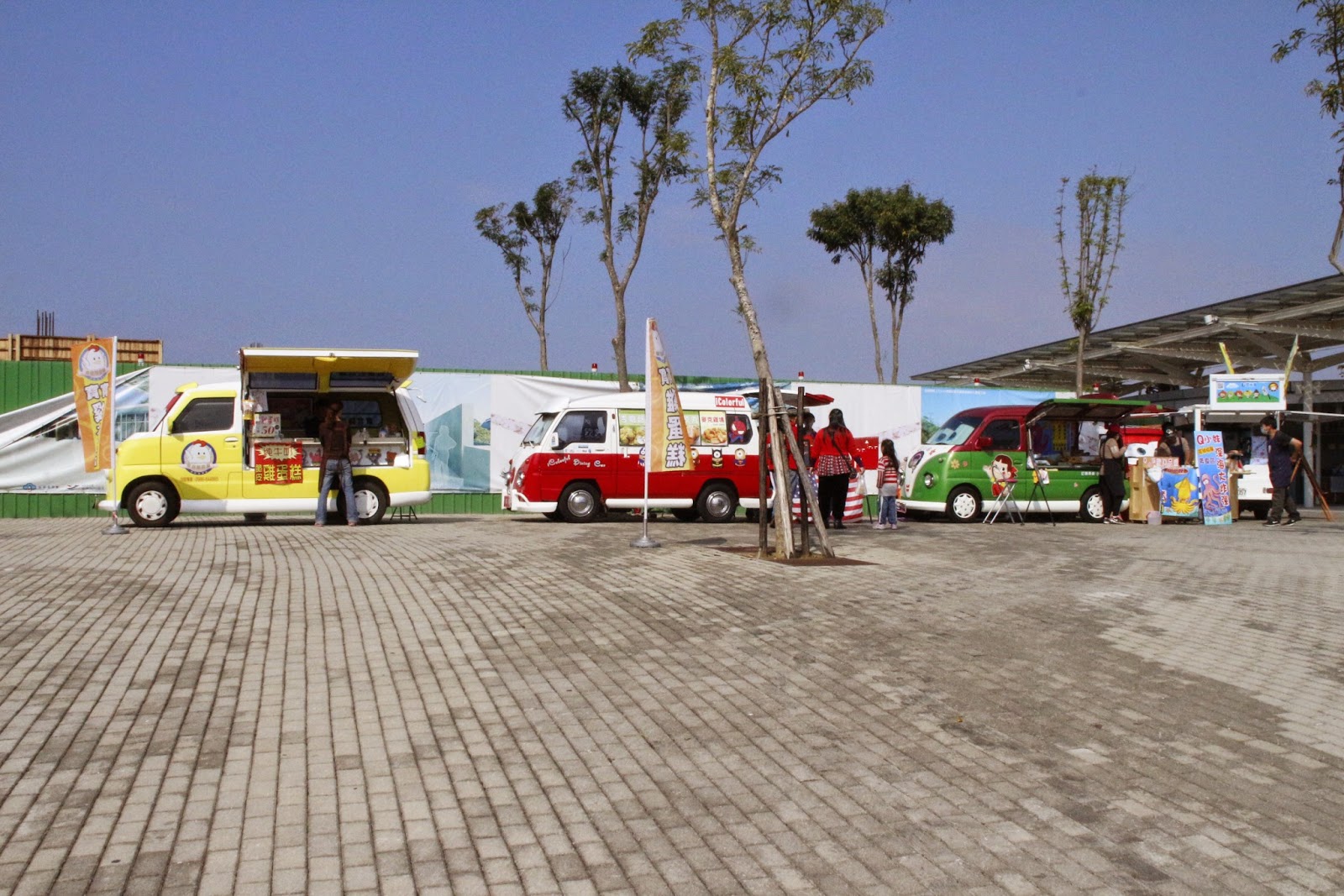 門口弧形排列了五六台不同飲食產品的胖卡,讓冷冰冰的建築本體軟化不少