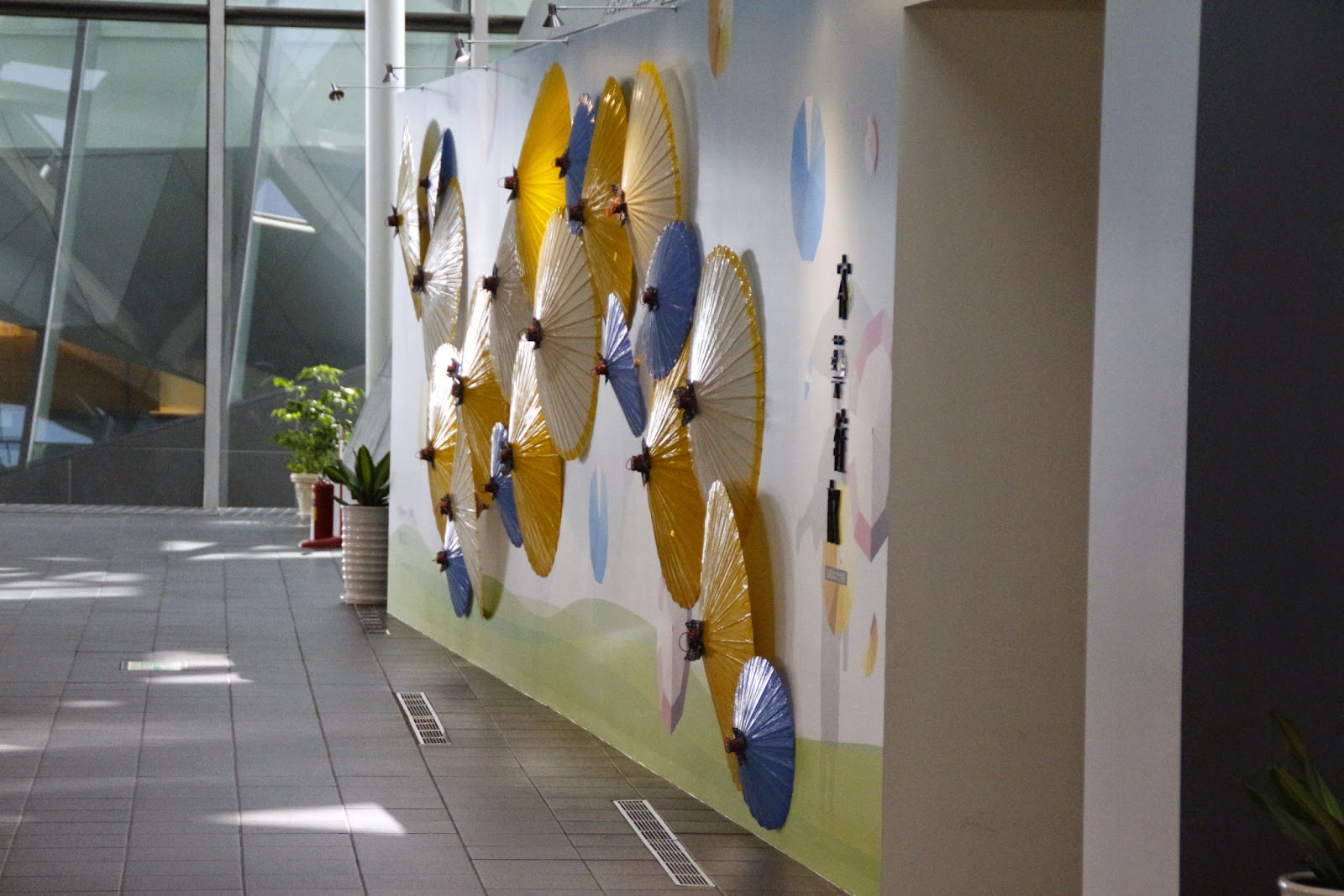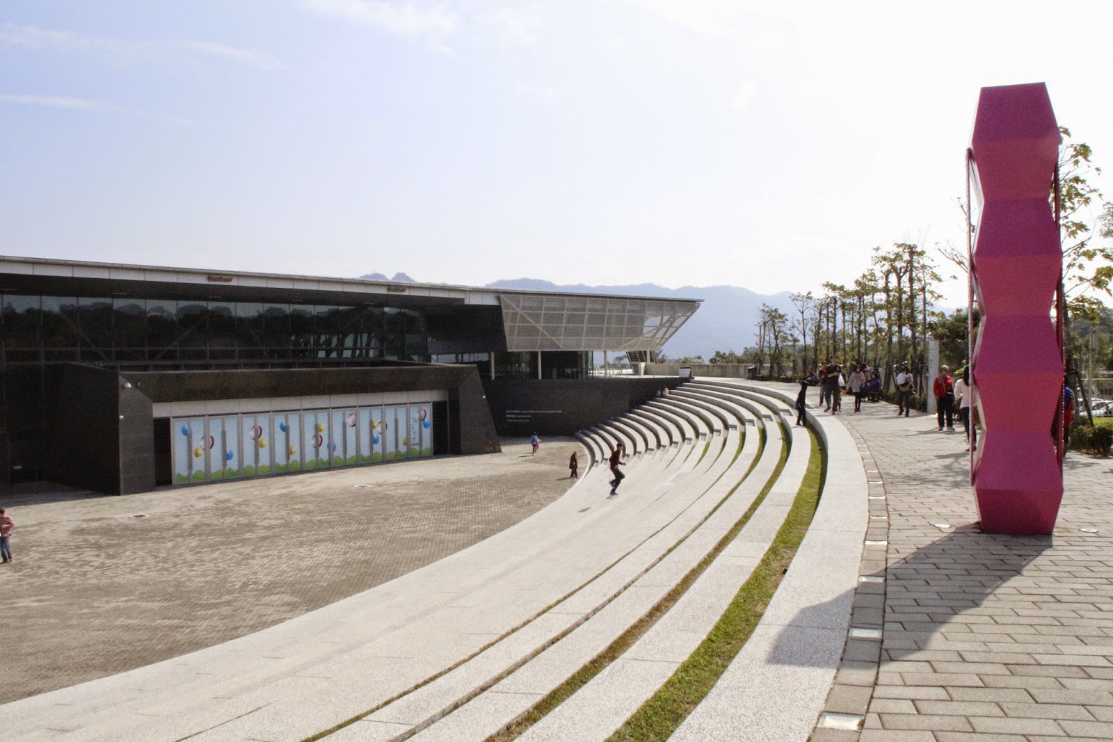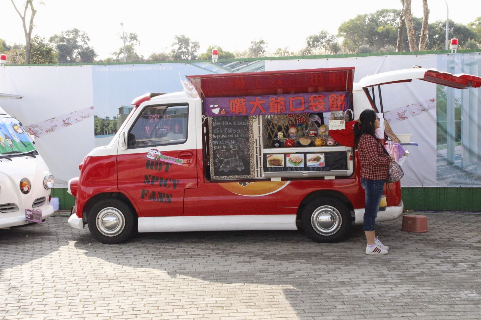門口弧形排列了五六台不同飲食產品的胖卡,讓冷冰冰的建築本體軟化不少
